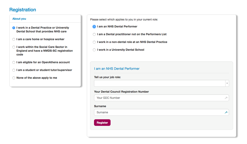 In order to register you will need to provide us with a valid email address. If you wish to access the hub due to your job role and responsibilities, please provide your work email address as this will help us to determine which e-learning programmes can be made available to you.  Full access to the e-learning is available if you self-register using a valid @nhs.net, @gov.uk, @ac.uk email suffix. Failure to do so may prevent you gaining access to the programmes you are looking for.  If your email address is not one of the recognised UK healthcare / student email extensions (for example @uhb.nhs.uk@hscni.net, @ac.uk), we may require additional information for validation. Once you have provided the necessary validation, you will also be required to provide the following information: